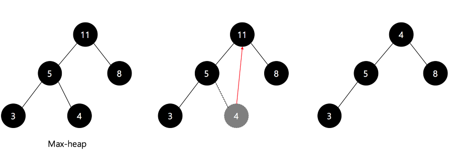 위와 같이 힙에서 루트를 마지막 노드로 대체하는 모습을 보여주고 있다.