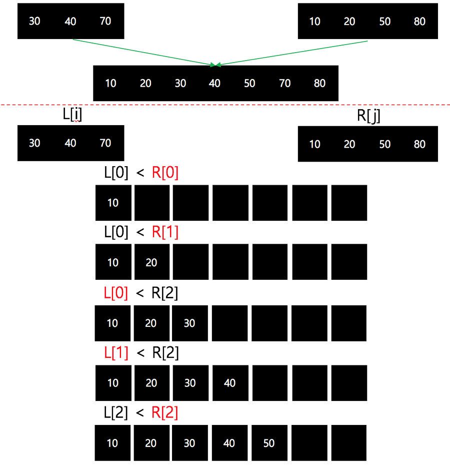 그래서 단순히 두 배열을 순차적으로 비교하여 정렬할 수 있게 된다.
