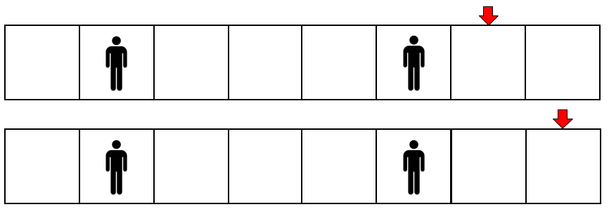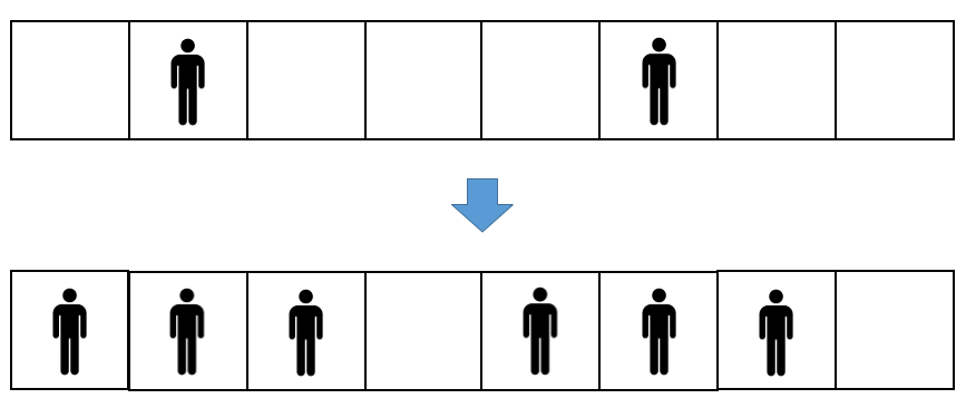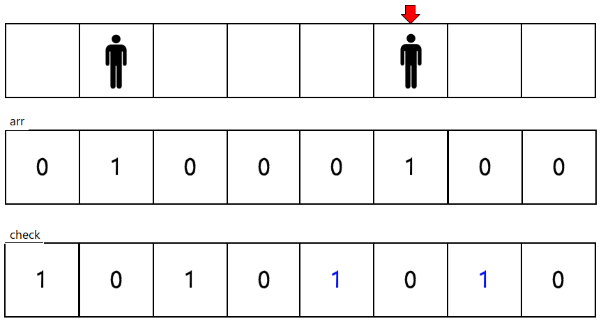 다음과 같이 1차원 맵(배열)에 사람이 있고, 사람이 있는 자리의 양쪽에 사람을 추가로 배치하려고 한다.