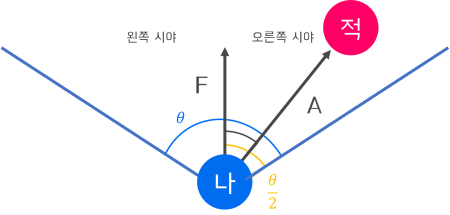 각이 90도 ~ 270도 사이에 있으면(cosθ가 음수이면) 적이 나의 뒤에 있는 것이다.