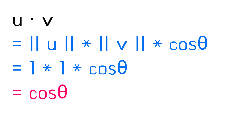 u와 v가 모두 단위 벡터인 경우 u·v는 두 벡터 간 각도의 코사인이 된다.