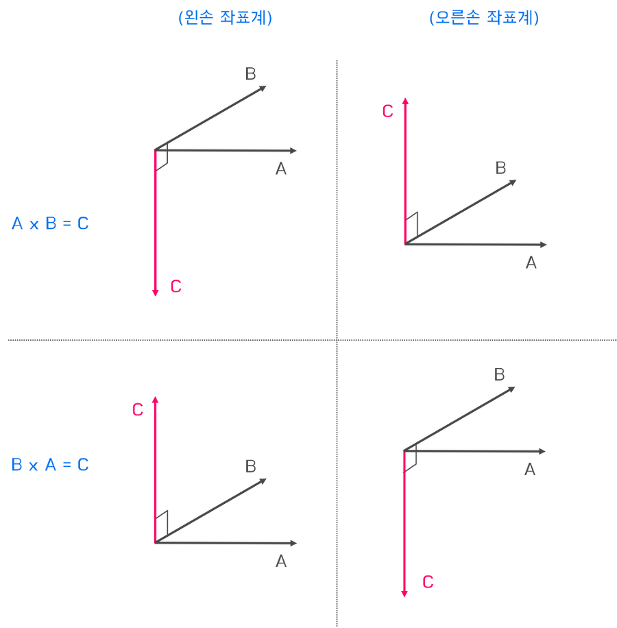 엄지손가락이 가리키는 방향이 바로 외적으로 리턴되는 벡터의 방향이 된다. (수학에서는 오른손 좌표계이니, 방향이 반대다. 헷갈리지 말 것!)
