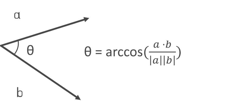 두 벡터의 성분을 알고 있다면, 크기를 알 수 있고 내적 계산을 이용해 arccosθ를 통해 구할 수 있다.
