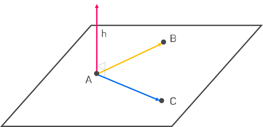 벡터 BA와 평면의 법선 벡터(normal vector)와 내적을 구하면, ||BA||∗cosθ값이 된다.