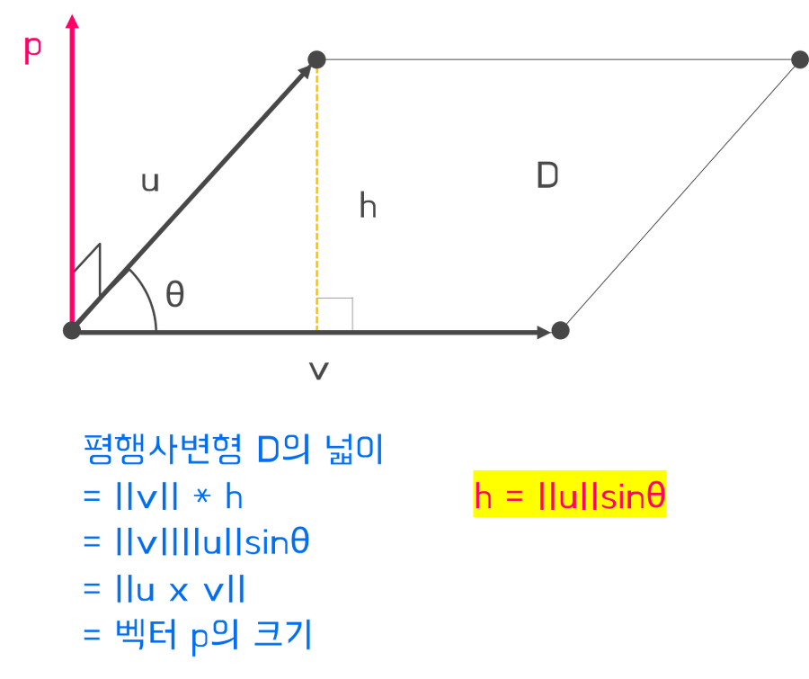 u와 v의 외적 결과값인 벡터 p의 크기로 u와 v의 사이각을 판단할 수 있다.