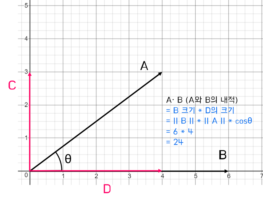 벡터 D의 크기는 A 벡터의 크기에 cosθ를 곱한 것이다.