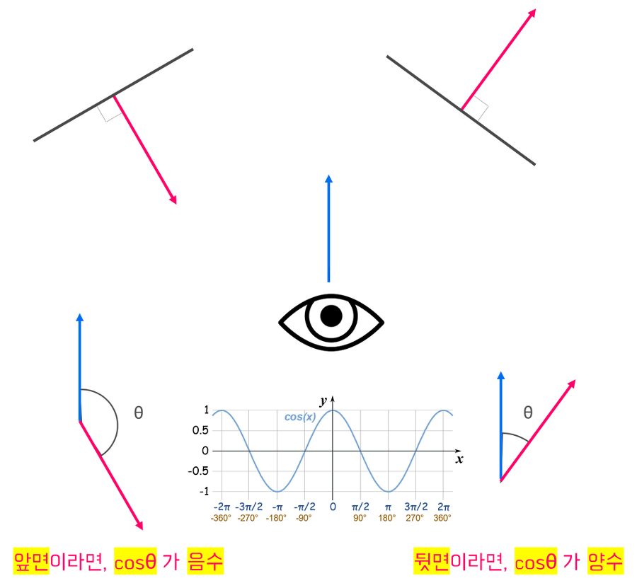 eye 벡터와 평면의 법선 벡터의 내적으로부터 얻는 cosθ 값을 사용하면 앞과 뒤를 판단할 수 있다.