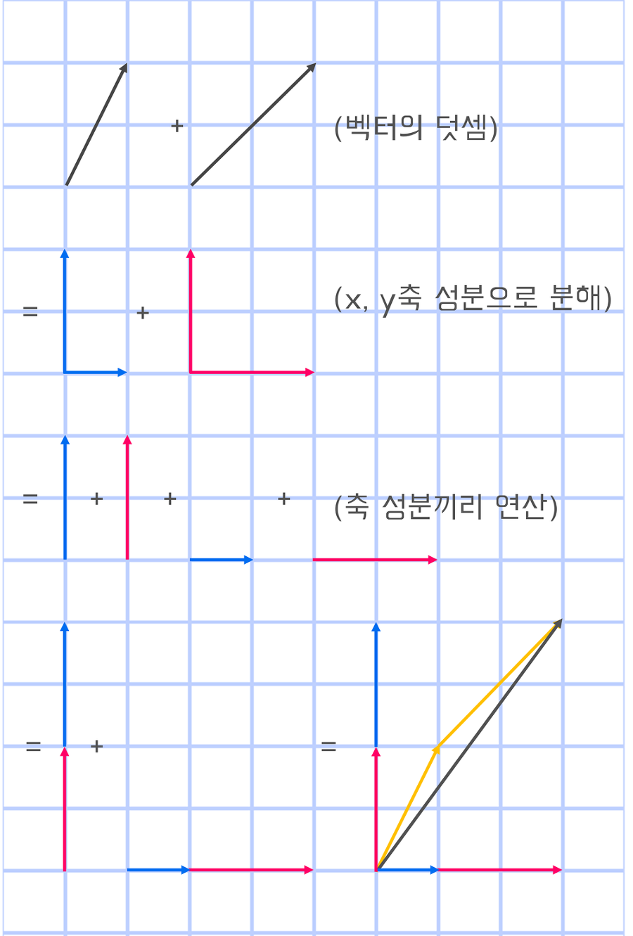 각 벡터를 x, y 축의 두 성분 벡터로 분해하여 연산하면 다음과 같다.