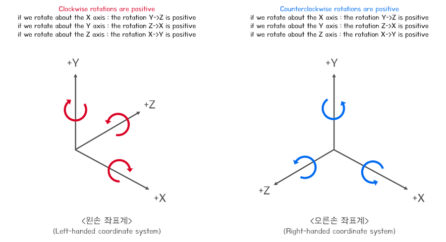 왼손 좌표계에서 회전 방향은 각 축에 대해 시계방향(clockwise)이다.