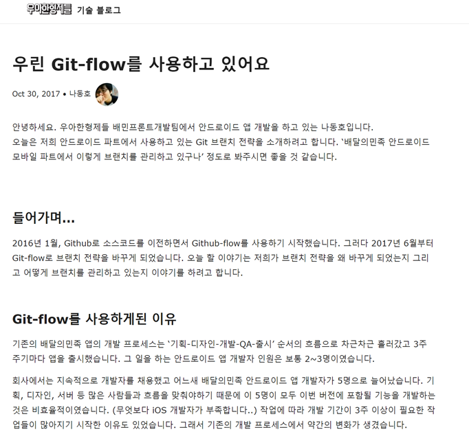 배달의 민족을 개발하는 우아한 형제들이 GitHub-flow를 사용하다 Git-flow로 브랜치 전략을 바꿨다는 글을 접했습니다. 이렇듯 브랜칭과 배포에 대한 전략을 상황에 따라 바뀔 수 있습니다.