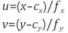카메라 내부 파라미터를 알면 다음과 같이 픽셀 좌표와 정규 좌표 사이의 변환이 가능합니다.