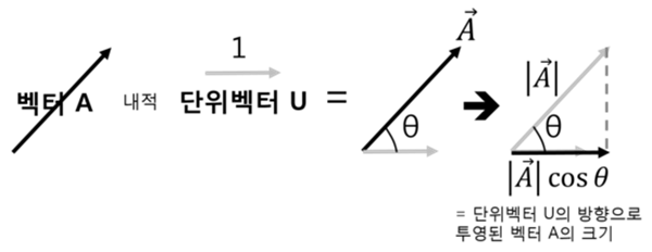 위 식에서 두 벡터의 내적은 두 벡터 사이의 각도의 코사인을 두 벡터의 크기에 곱한 것을 의미합니다. 여기서 두 벡터 모두 단위 벡터일 때, u와 v에 대한 내적 은 두 벡터 사이의 코사인 각입니다.