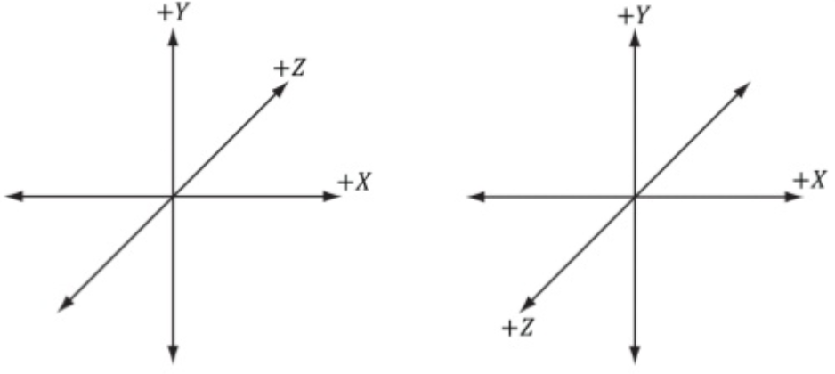 Direct3D는 왼손잡이 좌표계(left-handed coordinate system)를 사용합니다. 왼손잡이 좌표계와 오른손잡이 좌표계의 차이는 다음과 같습니다.
