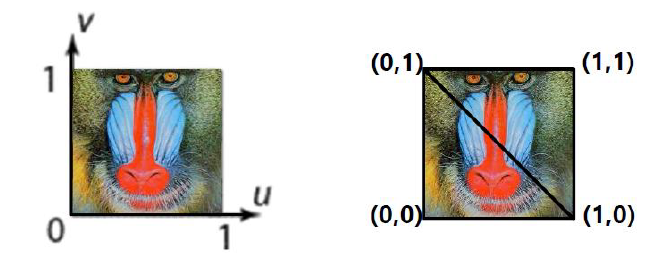 -> 각삼각형 꼭지점에 (u,v)좌표가 할당되어 삼각형에 붙을 텍스쳐의 어느 부분을 붙여야 하는지 알 수 있음